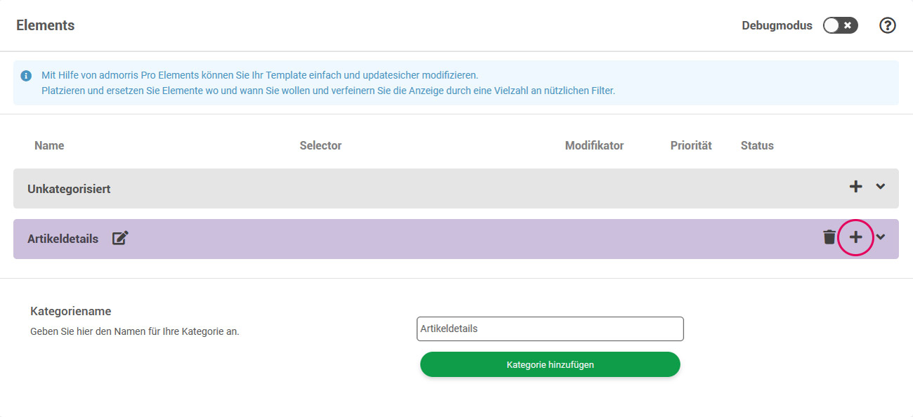 Falls es noch keine passende Kategorie (in unserem Beispiel: 'Artikeldetails') gibt, empfehlen wir Ihnen eine solche anzulegen.